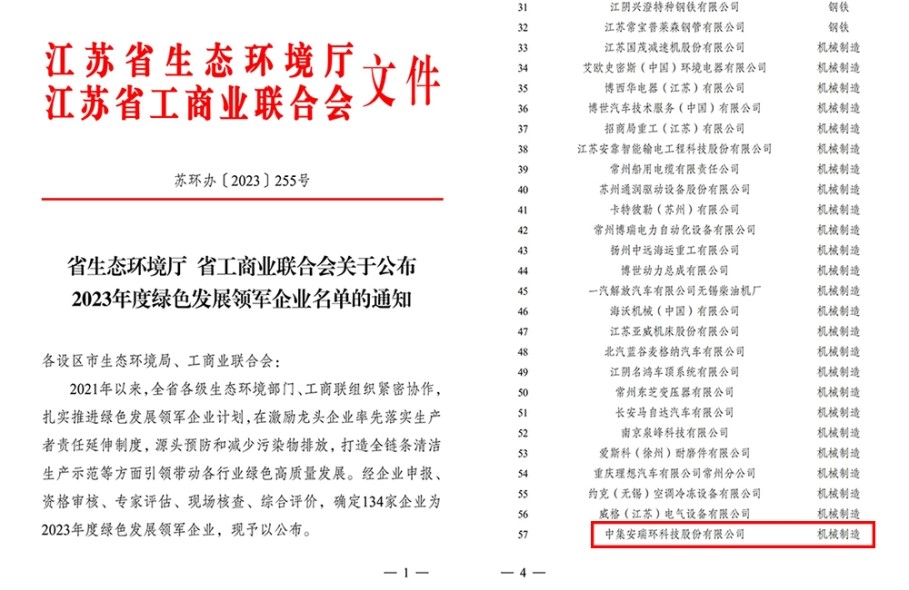 近期,江苏省生态环境厅与江苏省工商业联合会联合发布“2023年度绿色发展领军企业”名单,中集安瑞环科技股份有限公司上榜。